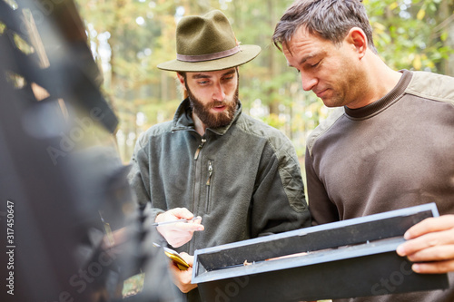 Förster und Praktikant mit Borkenkäferschlitzfalle