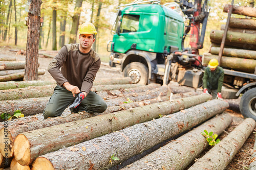 Waldarbeiter als Holzfäller in Schutzkleidung im Wald
