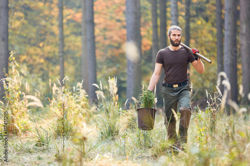 Junger Förster im Wald bei Aufforstung