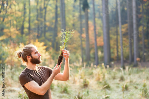 Waldarbeiter oder Forstwirt mit Kiefer Setzling