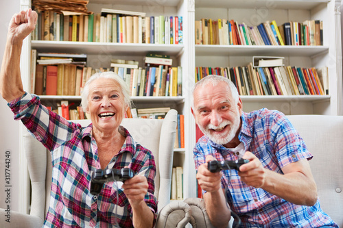 Paar Senioren spielt Videospiel mit Konsole im Wohnzimmer