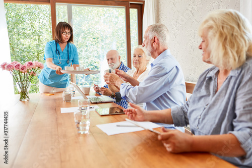 Nursing lady serves coffee for seniors