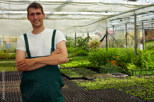 Smiling male farmer with organic plants in wheelbarrow