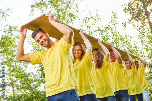 Sieger Mannschaft mit Pokal jubelt bei Teambuilding Event