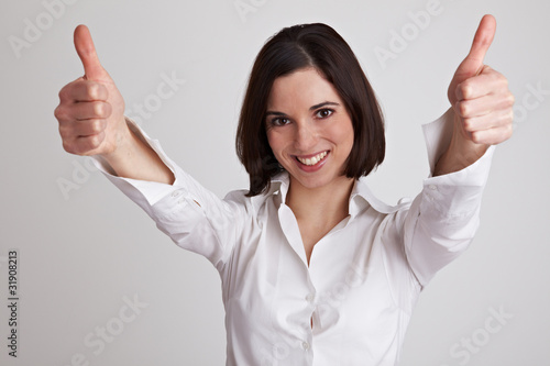 Confident businesswoman giving thumbs up in a black suit with a smile