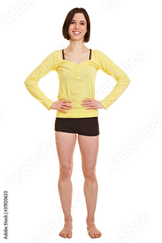 Junge blonde Frau frontal mit Händen in der Hüfte