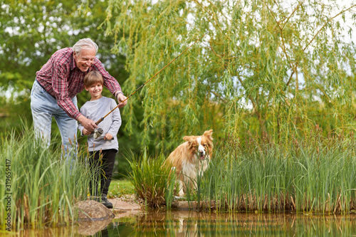 Opa zeigt seinem Enkelsohn das Angeln am See