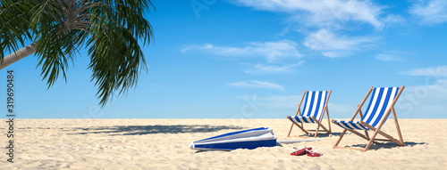 Liegen auf Sand Strand mit Palme und blauem Himmel