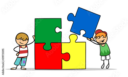 Zwei Kinder lösen Puzzle als Zusammenarbeit Konzept