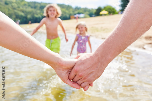 Familie zeigt bunte Zeichnung mit Eigenheim