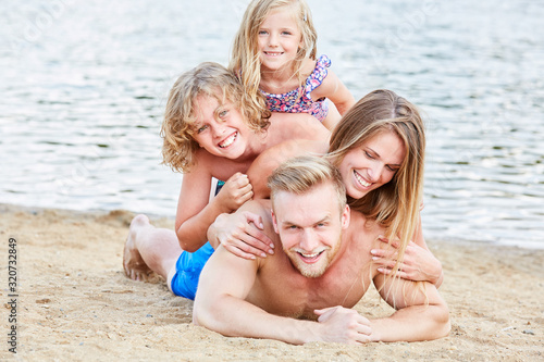Happy family with two kids at the beach
