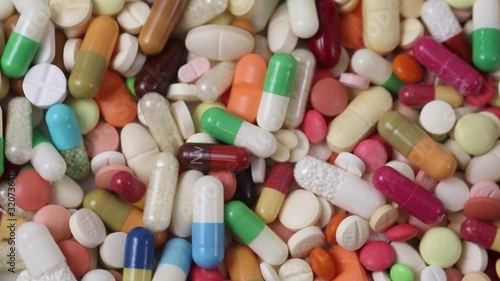 Closeup of pile of pills in blisters rotating counterclockwise in a loop