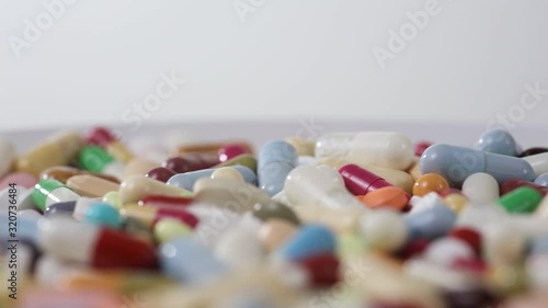 Closeup of pile of pills in blisters rotating counterclockwise in a loop