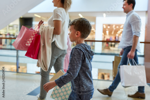 Familie mit Einkaufswagen in einem Fahrstuhl