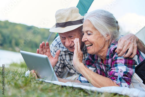 Senioren Paar im Zelt beim Videochat