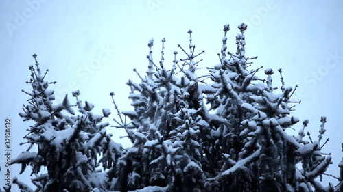 Dramatic seasonal landscape with snow-covered trees and falling snowflakes