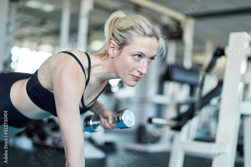 Frau gibt Bewertung am Smartphone im Fitnesscenter