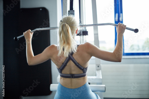 Frau gibt Bewertung am Smartphone im Fitnesscenter
