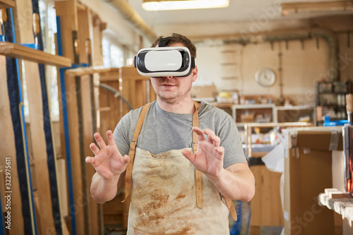 Tischler mit VR-Brille visualisiert Raumgestaltung