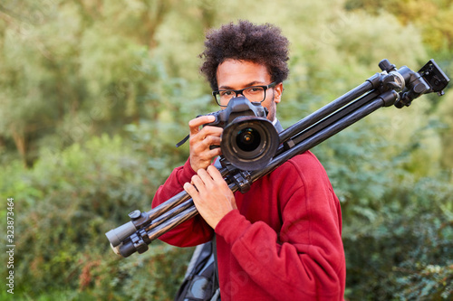 Fotografin mit Kamera und Stativ als Naturfotograf