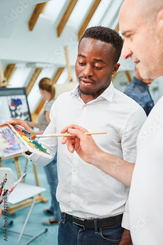 Kreativer Mann beim Malen an Leinwand auf Staffelei