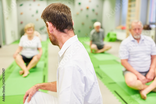 Physiotherapeut macht mit Senioren Rückengymnastik