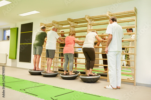 Gruppe Senioren bei Physiotherapie auf Bosu Ball