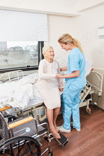 Caregiver helps ill elderly woman to get up