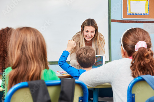 Grundschüler im Unterricht mit Lehrerin