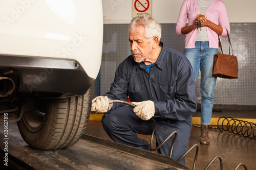 Senior als KFZ Mechaniker beim Reifenwechsel