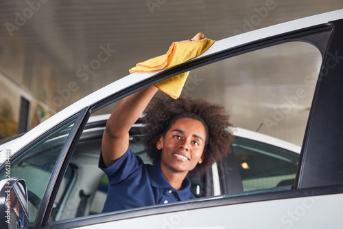 Afrikanische Frau poliert Tür vom Auto im Autohaus