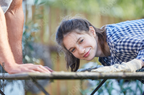 Junge Frau trägt mit ihrem Freund eine Tischplatte