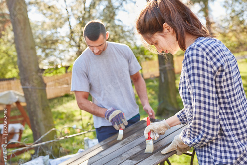 Paar grundiert und lackiert gemeinsam einen Holztisch