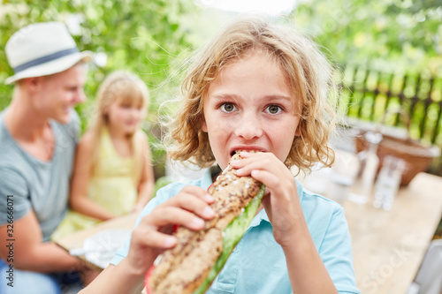 Junge isst eine leckeres frisches Baguette