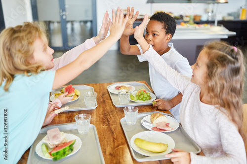 Gruppe Leute beim Essen schaut auf Smartphone Bildschirm