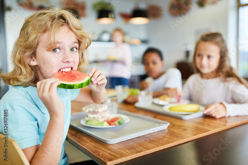 Kinder essen in Kantine einer Grundschule Mittagessen