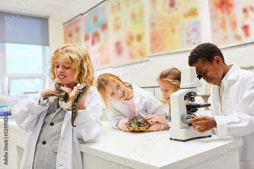 Mädchen in Schule steht vor Tafel mit Muskeln