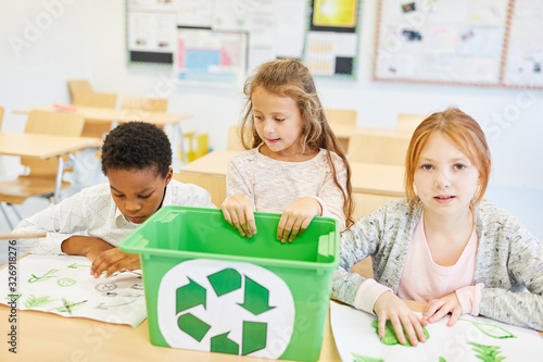 Mädchen in Schule steht vor Tafel mit Muskeln