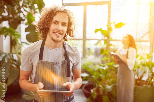 Mann macht Ausbildung zum Floristen im Blumenladen