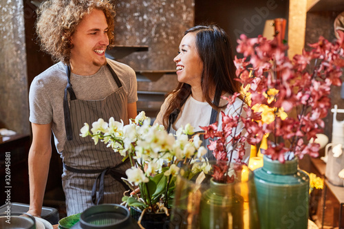 Junge Floristin trägt Zimmerpflanze für die Lieferung