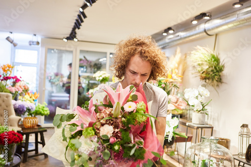 Asiatische Frau als Floristin dekoriert Blumengebinde