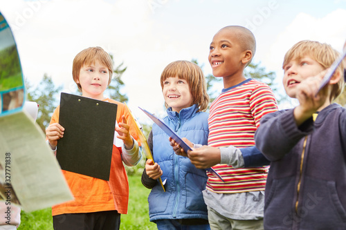 Kinder mit Klemmbrettern auf Schnitzeljagd