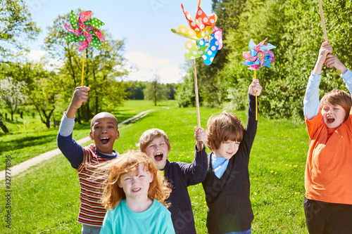Kinder feiern Geburtstag mit bunten Windrädchen