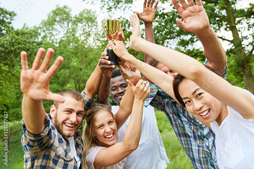 Gruppe junger Leute mit Pokal jubelt