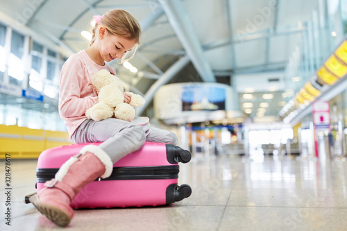 Kleines Mädchen mit Plüschtier wartet im Terminal