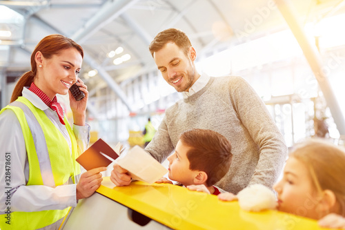 Vater und Kinder am Flughafen Check-In Schalter