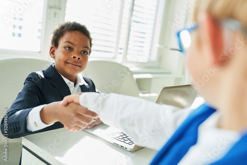 Afrikanischer Junge ballt die Fäuste am Laptop
