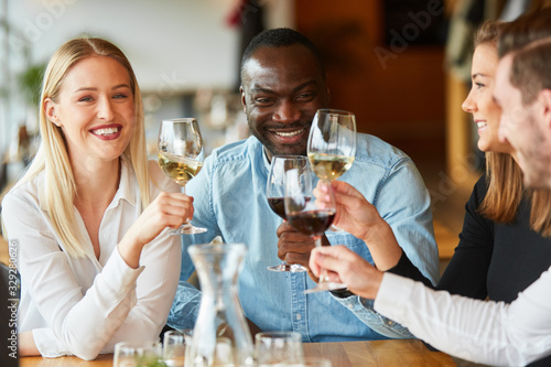 Freunde im Bistro beim Zuprosten mit Glas Wein
