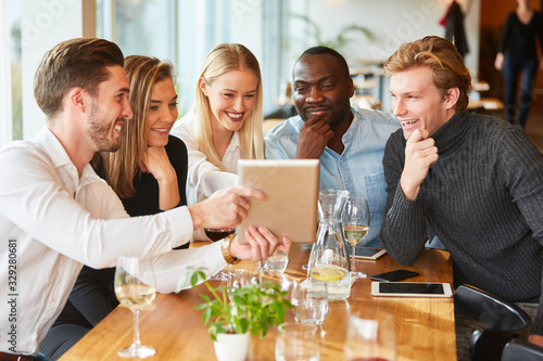Freunde im Bistro beim Zuprosten mit Glas Wein