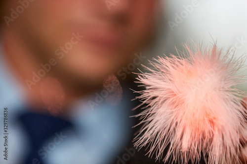 Elegant pastel pink and gold Christmas background with soft feathers and sparkling bokeh